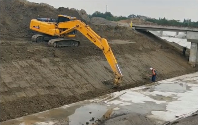 乐虎lehu国际官网挖掘机河道施工,精细化修坡