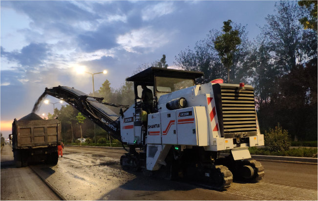 夕阳西下,华灯初上。G327国道路面翻新工程,5公分沥青面层铣刨,行走速度可达20m/min左右。